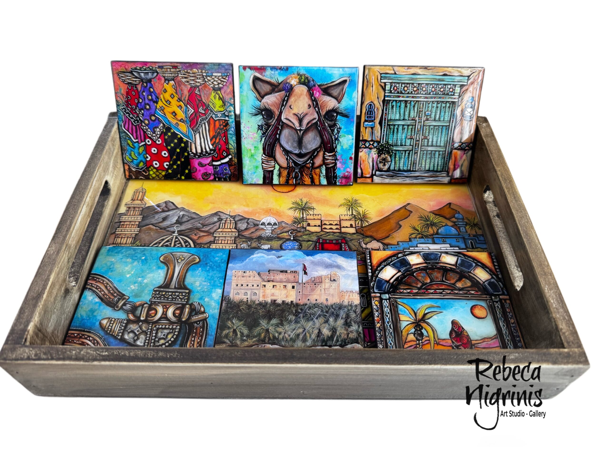 This wooden serving tray (32×22 cm) showcases my vibrant artwork and is carefully sealed with a durable epoxy resin finish, providing long-lasting protection, a smooth glossy surface, and easy cleaning. Nestled inside the tray are six assorted coasters (10×10 cm each), also sealed with epoxy resin for enhanced durability and heat resistance.