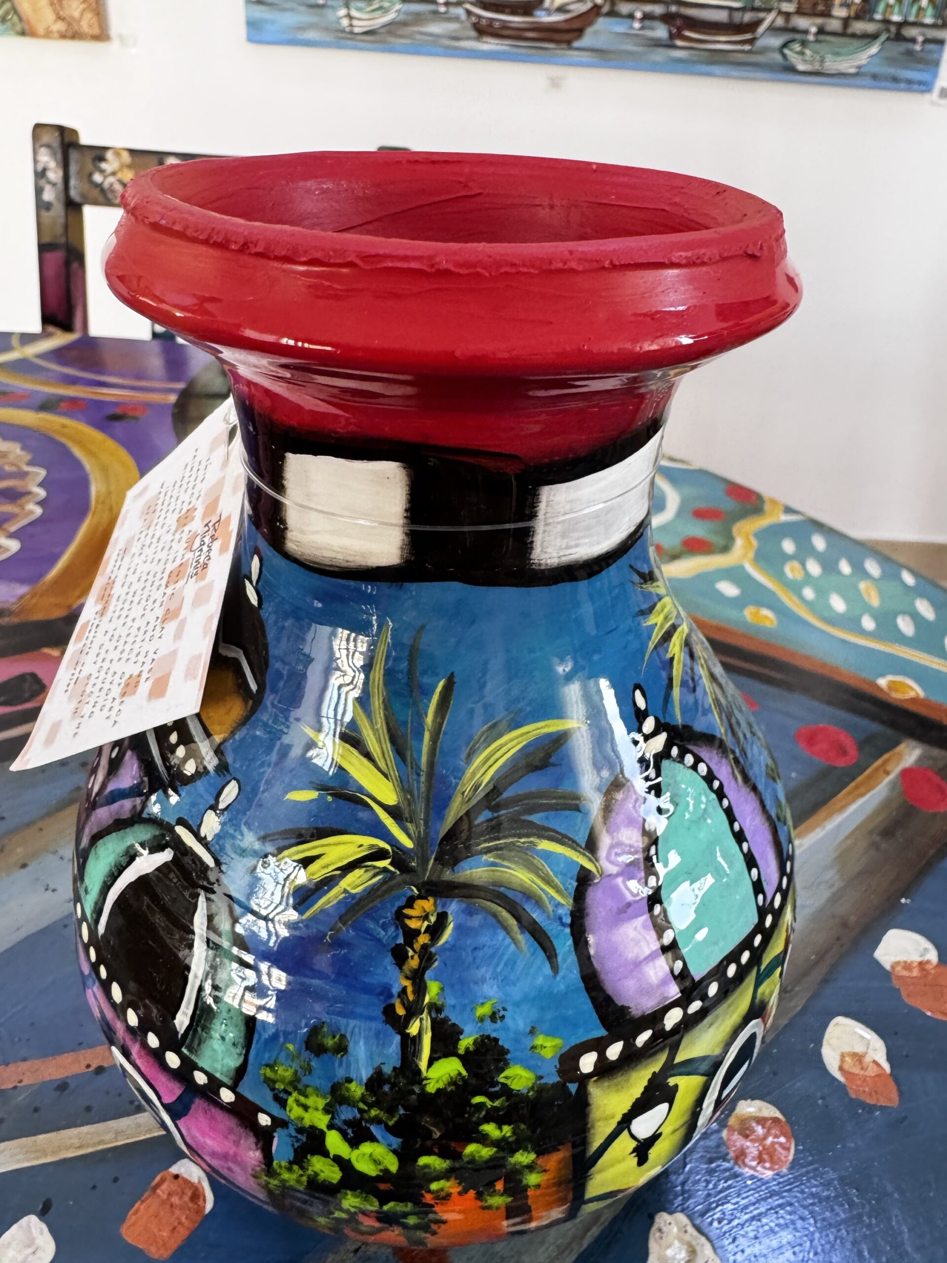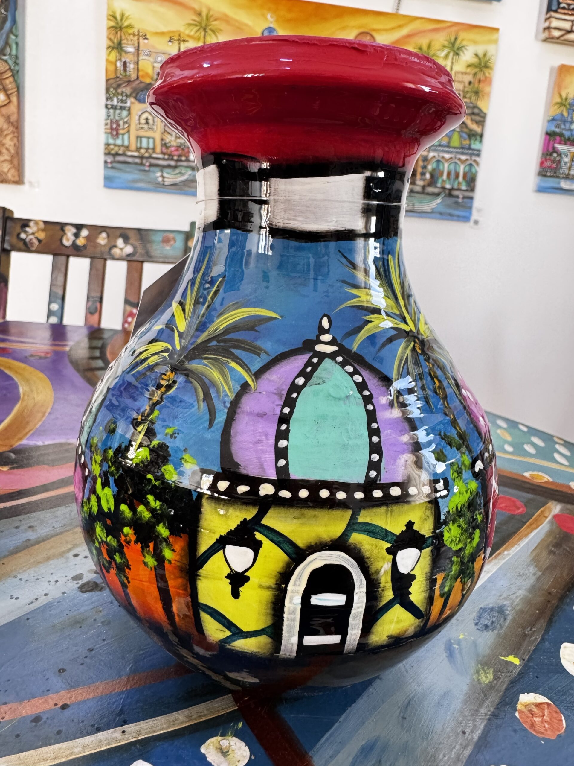 This beautiful clay vase is handcrafted in Oman and hand-painted by me with love. I finish each piece with epoxy resin, giving it a glossy liquid-glass look that protects the paint and makes the colours shine.